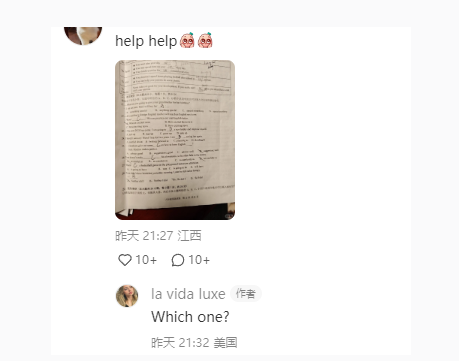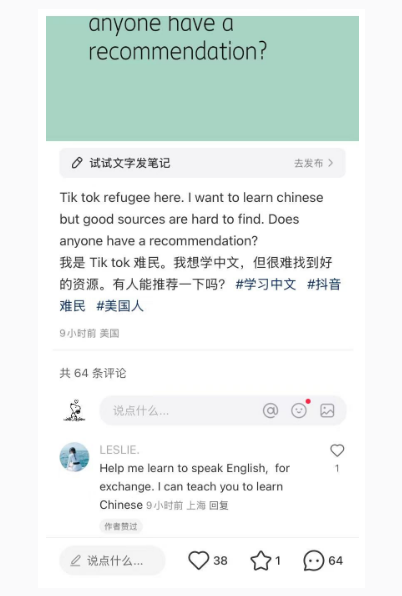 大批“TikTok难民”的涌入,也开启了小红书“英语角”这一新功能。无论是希望学习中文的外国用户,还是想提升英语水平的中国用户,都有机会在这里找到“语言搭子”。而一些美国网友自愿“辅导英语”的提议则引来了不少中国学生在线提问。