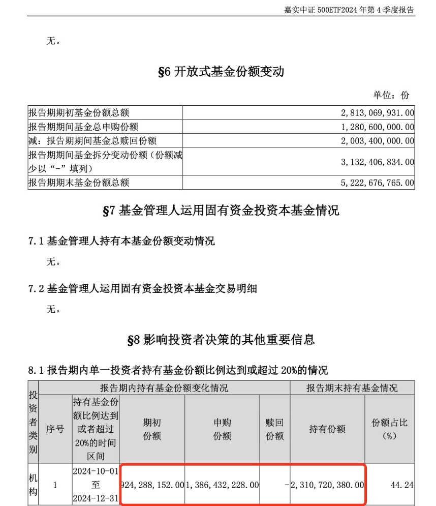 2024年10月25日至2024年11月13日,某机构投资者还分别申购24.07亿份、赎回3.55亿份富国中证A500ETF,2024年末最终持有20.53亿份该ETF,占比约为12.34%。